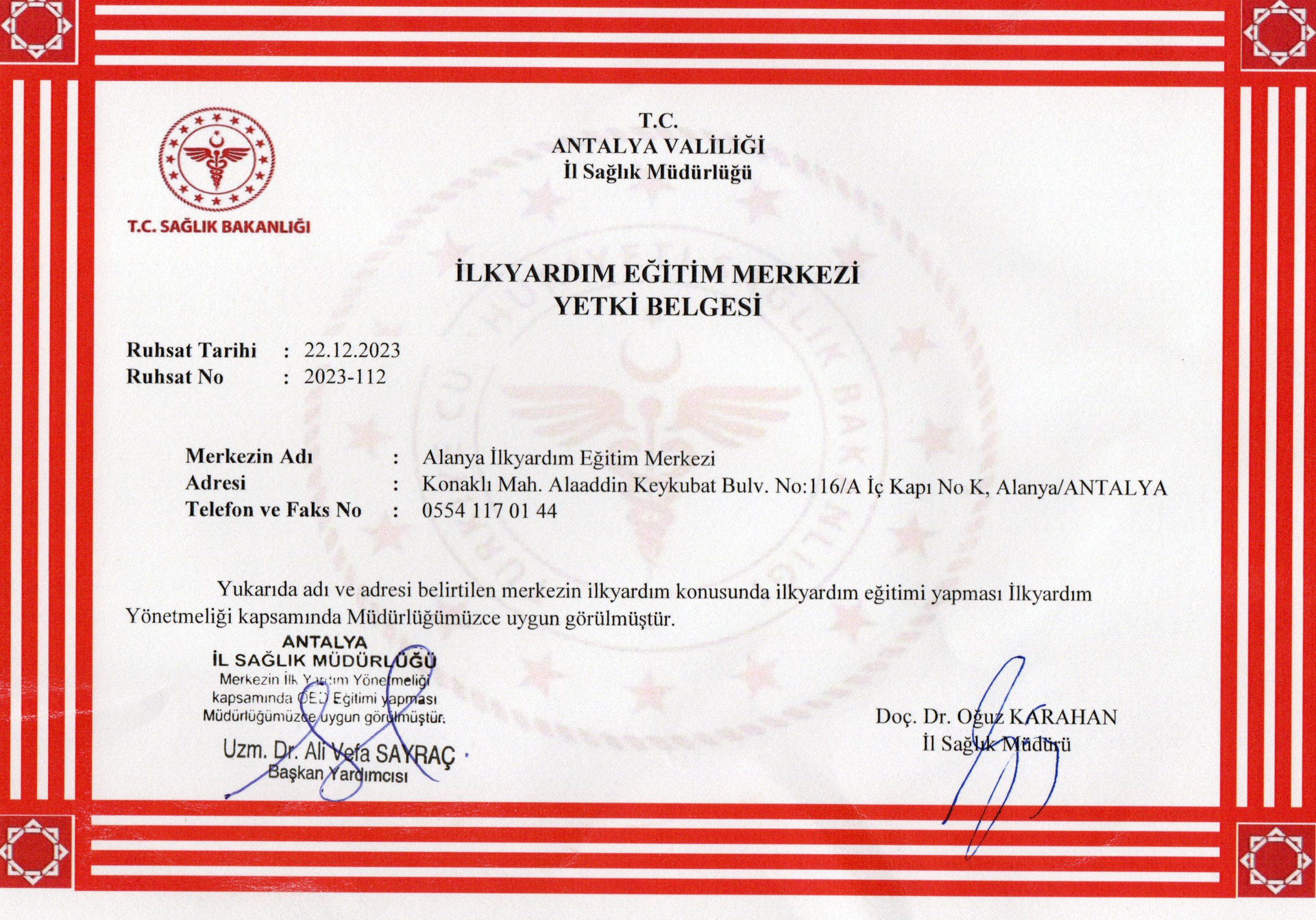 - Uygulamalı sınavdan da başarılı olan kursiyerlerimiz T.C. Sağlık Bakanlığı'ndan onaylı "İlkyardımcı Sertifikası" almaya hak kazanır. Bununla birlikte ayrıca "İlkyardımcı Kimlik Belgesi" de verilir.